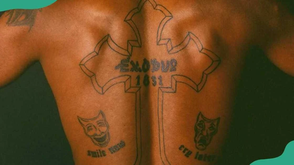 Tupac’s back tattoo with “1831” underneath “Exodus”